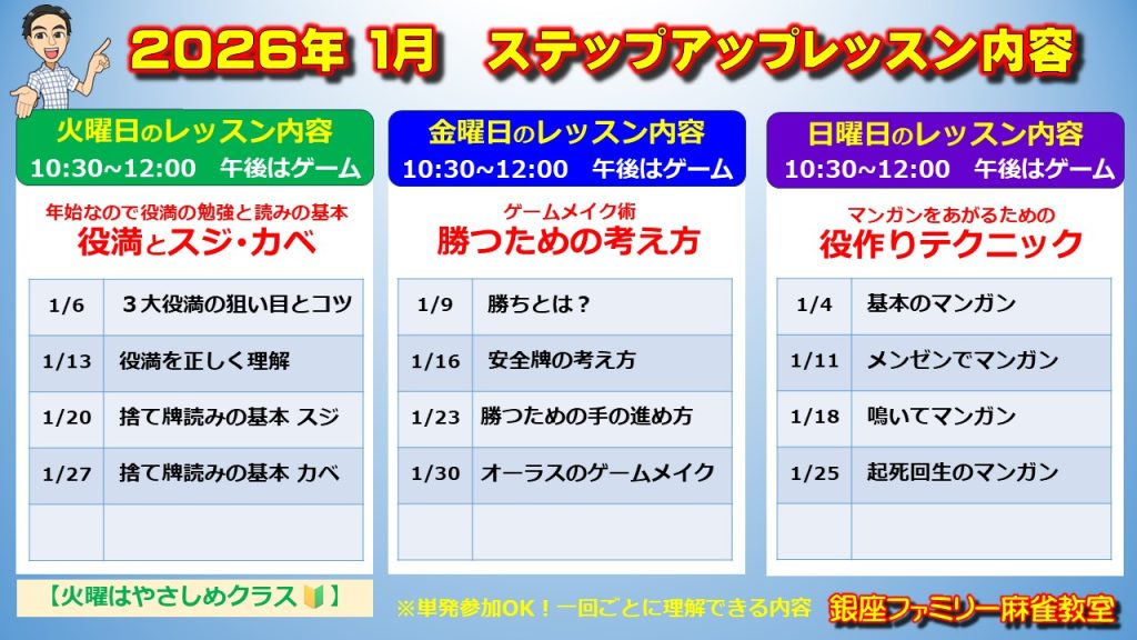 「感覚」で打つ麻雀から、「理論」で勝つ麻雀へ。 当教室のベーシックレッスンを一通り終えた方や、点数計算・役を覚えた経験者の方を対象に、「勝つための考え方」を教えます。 ステップアップレッスンの詳しくはコチラ